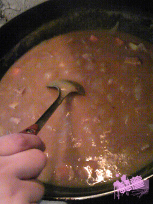 阿简煮着冒着很萌的泡泡的浓稠咖喱的时候,小梦梦在一边(并不是什么也没干哦!)啃着阿简武汉带回的鸭脖子(是阿简抡着大砍刀帮我砍小的哦~),幸福啊~~~
